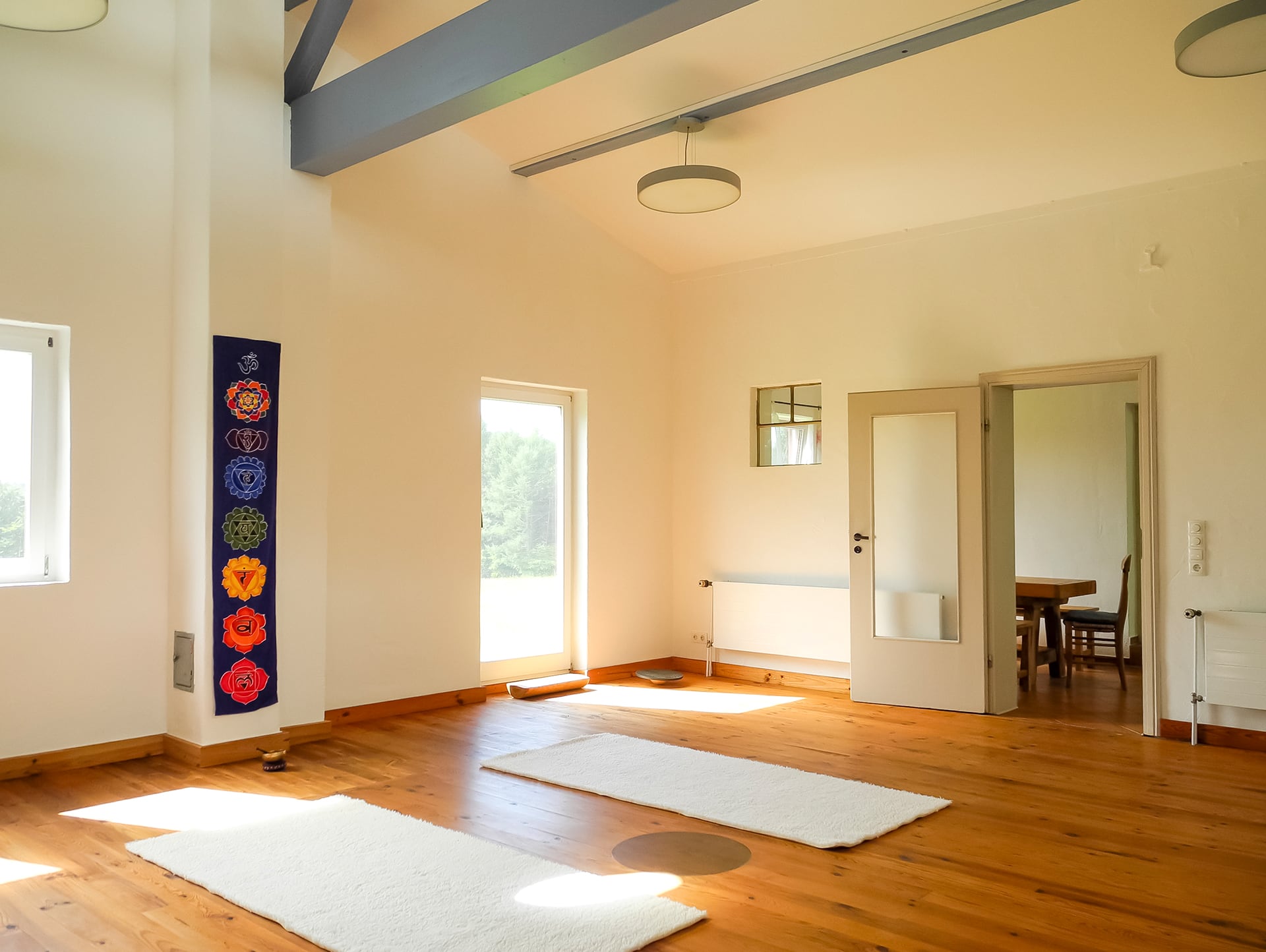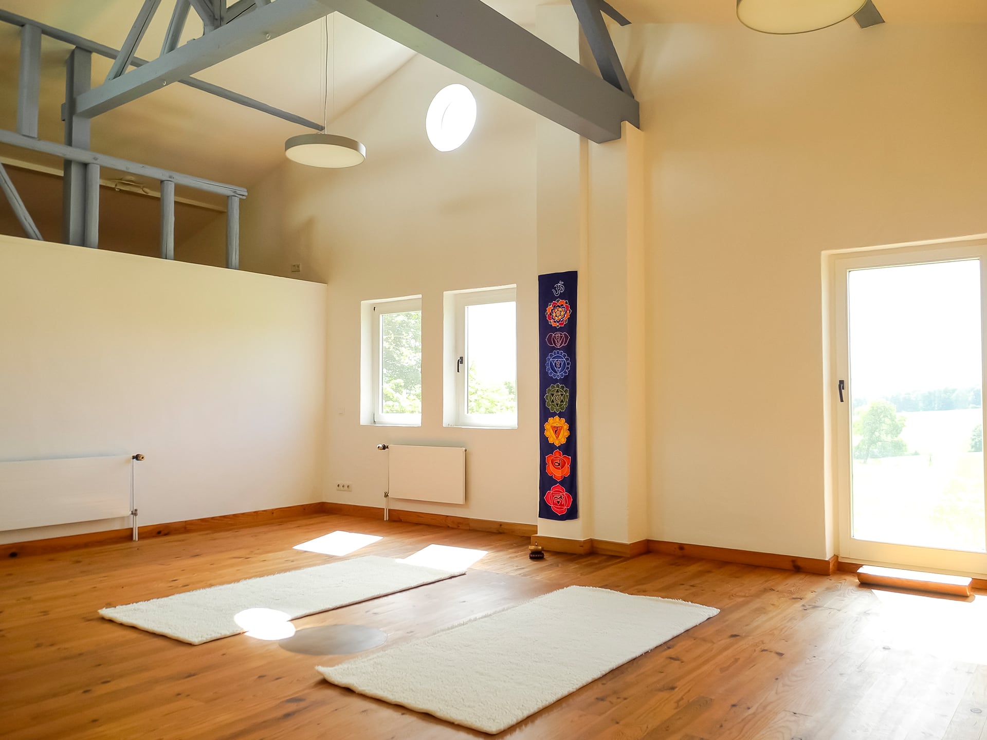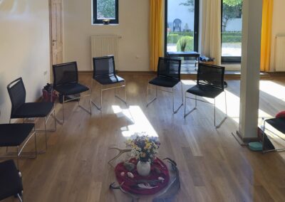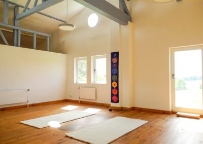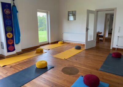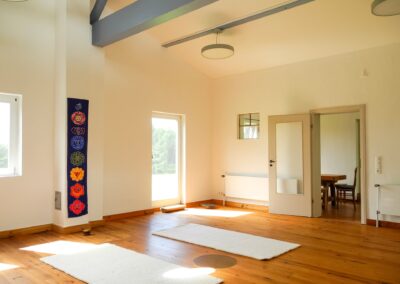 - Ein Yoga-, Heil- und Meditationsraum (ca. 40 m²), ebenfalls mit Holzboden und eingerichteter Teeküche und Aufenthaltsraum, Umkleidebereich und Bad (= Retreatbereich bis zu 12 Personen mit Schurwoll- und rutschsicheren Kautschukmatten, Sitzkissen, Decken etc.)