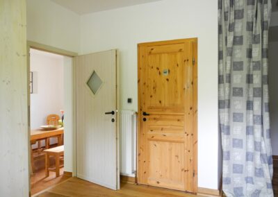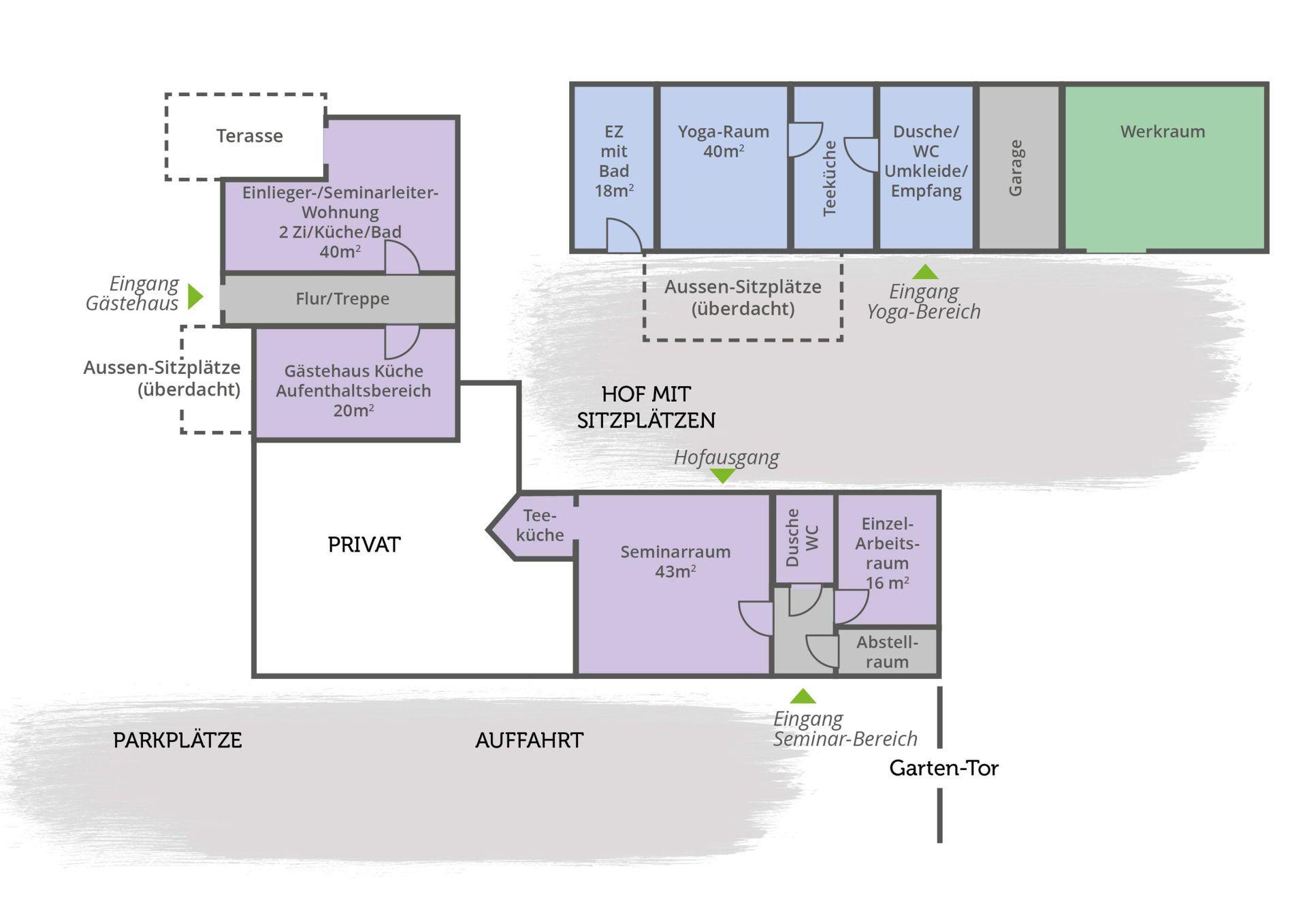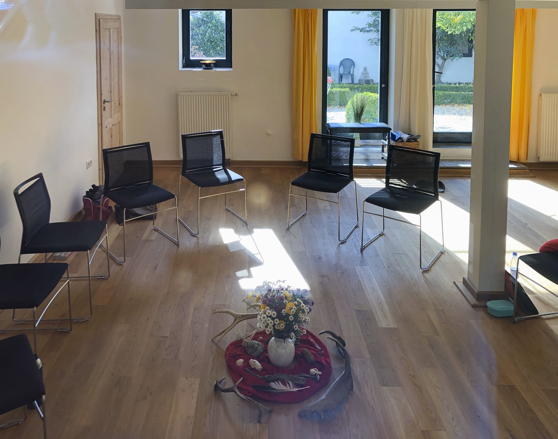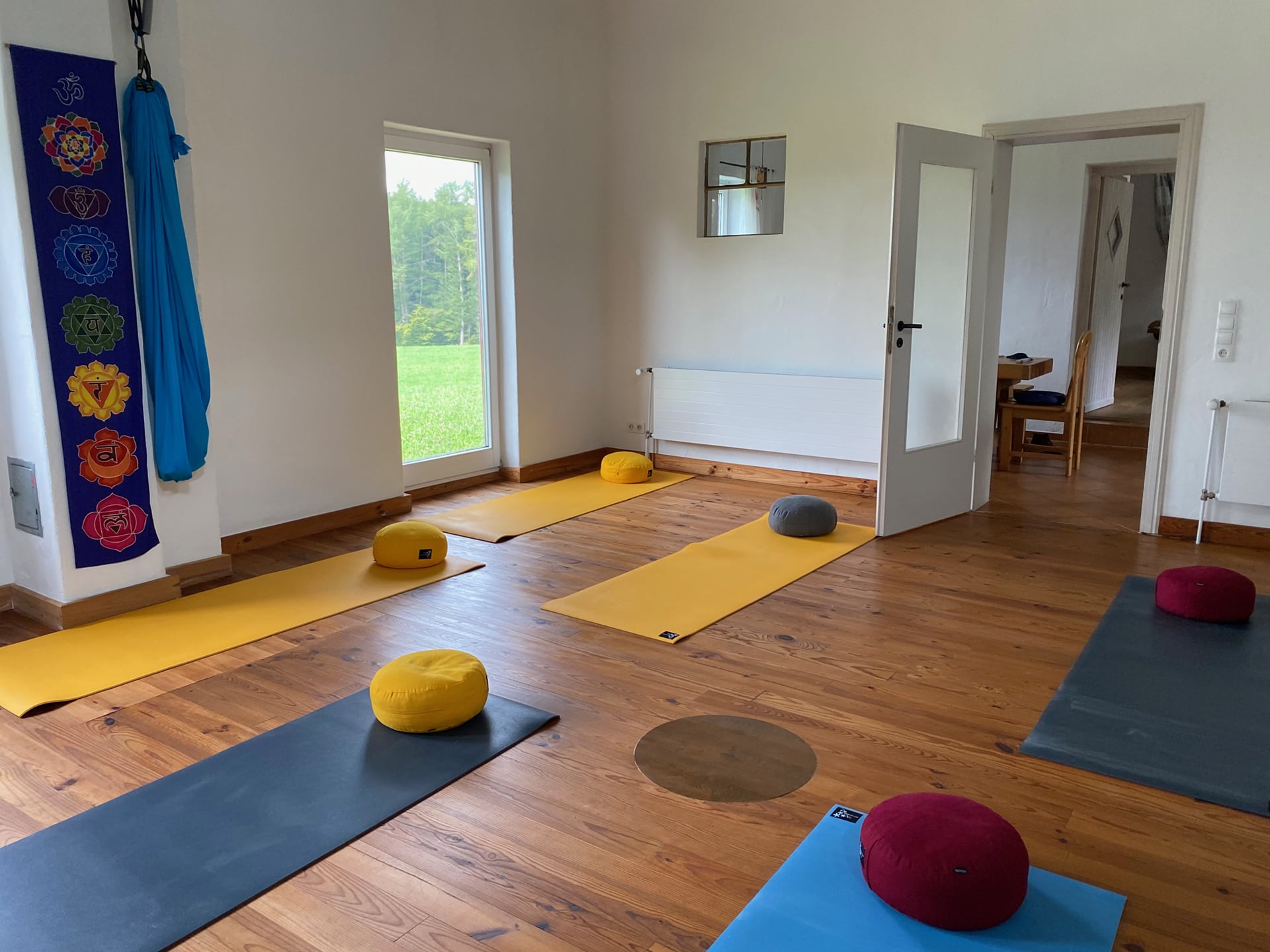 - Ein Yoga-, Heil- und Meditationsraum (ca. 40 m²), ebenfalls mit Holzboden und eingerichteter Teeküche und Aufenthaltsraum, Umkleidebereich und Bad (= Retreatbereich bis zu 12 Personen mit Schurwoll- und rutschsicheren Kautschukmatten, Sitzkissen, Decken etc.)