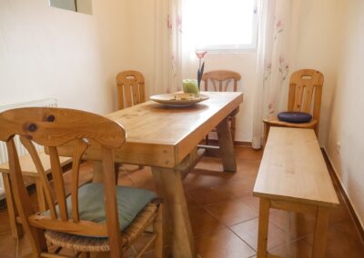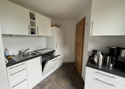 - Eine vollständig eingerichtete Gemeinschaftsküche mit Esstisch und Aufenthaltsbereich im Gästehaus