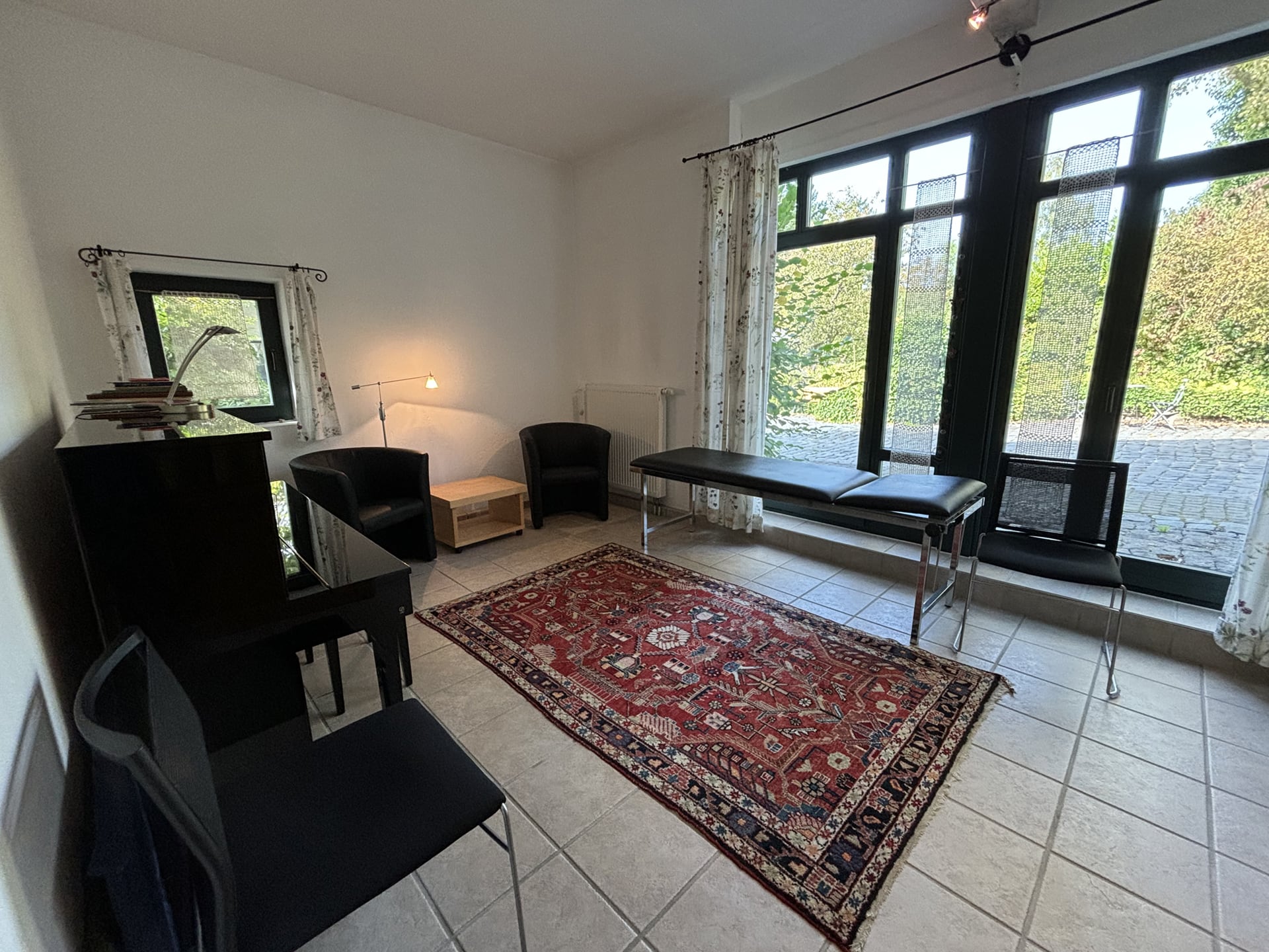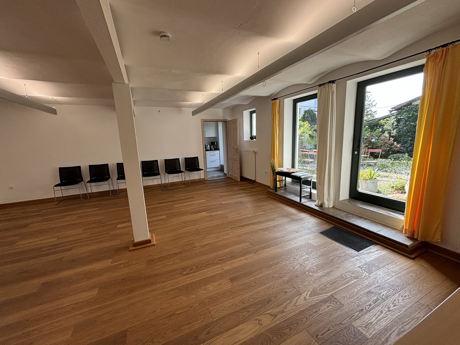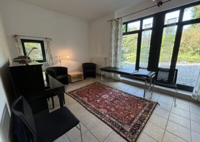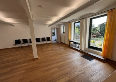 - Ein Seminarraum (ca. 40 m²) mit Holzboden und eingerichteter kleiner Teeküche und einem Einzelarbeitsraum mit Klavier plus Bad (= Seminar- und Veranstaltungsbereich bis zu 30 Personen mit Stühlen und Tischen)