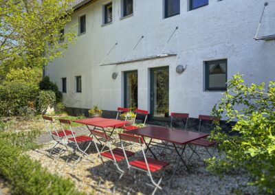 Ein unbeheizter großer Werkraum im Hof ermöglicht in den wärmeren Monaten zusätzlich künstlerisches und handwerkliches Arbeiten.