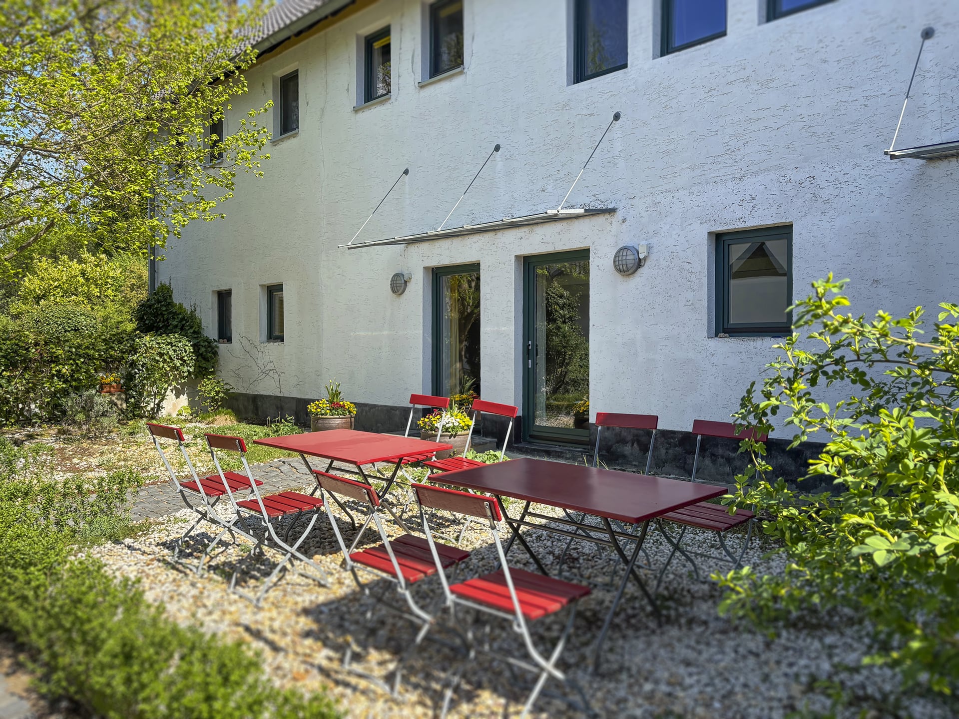 In einem Gebäude befindet sich der Seminarbereich mit einem großen und einem kleinen Raum plus Teeküche, Flur und Bad.
